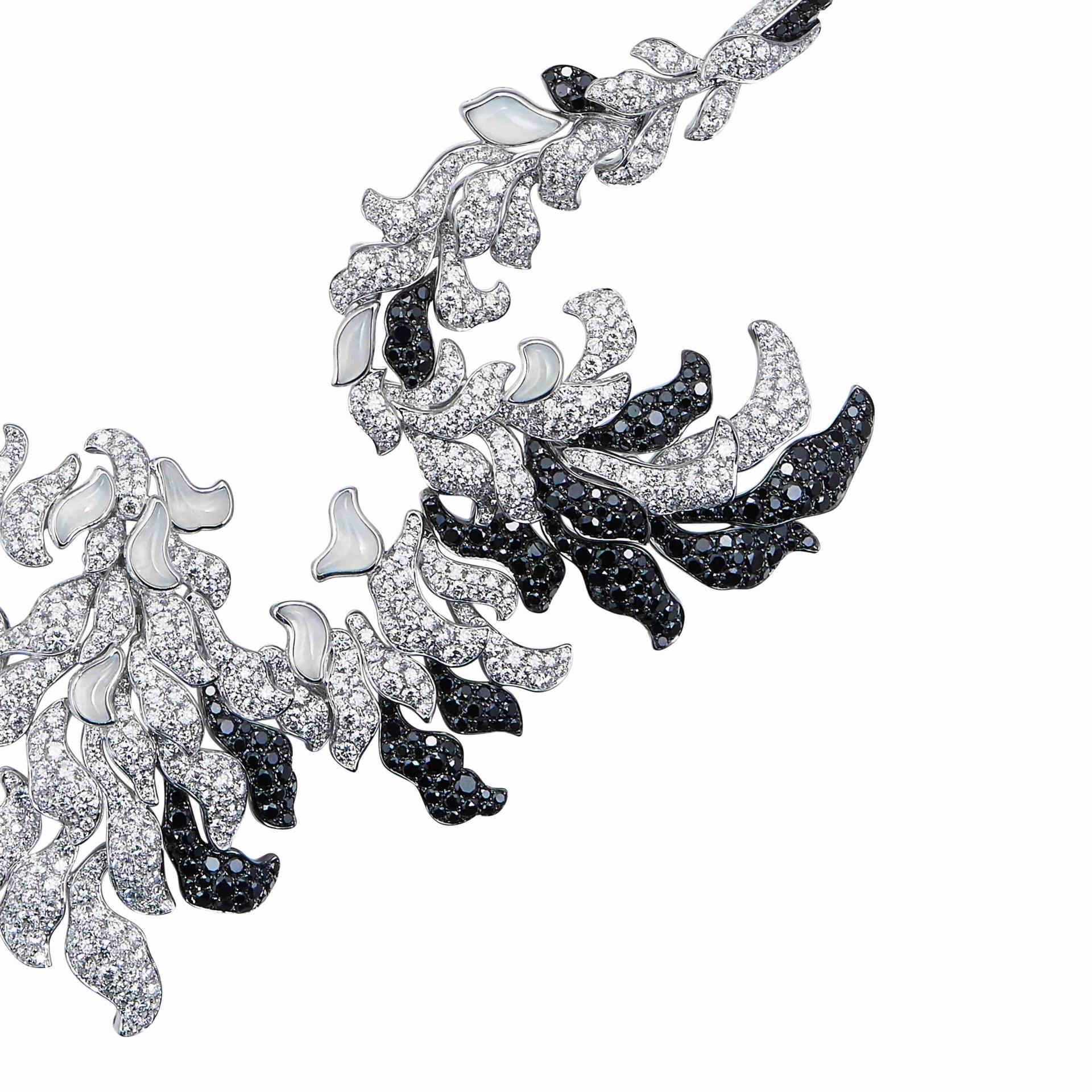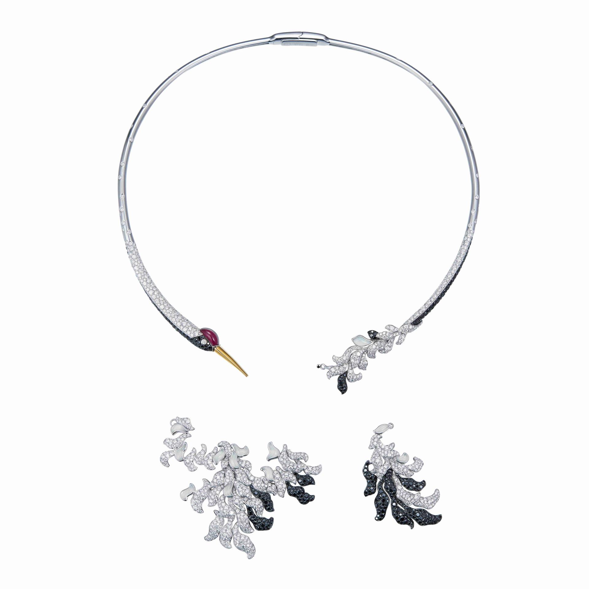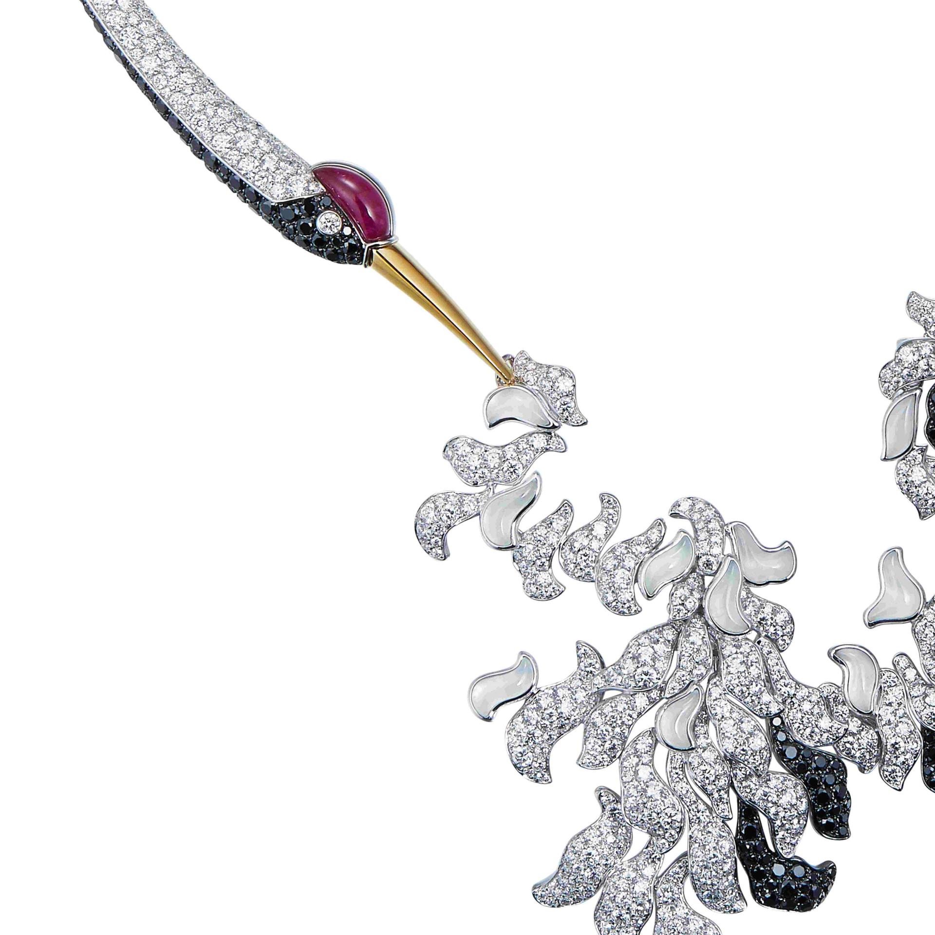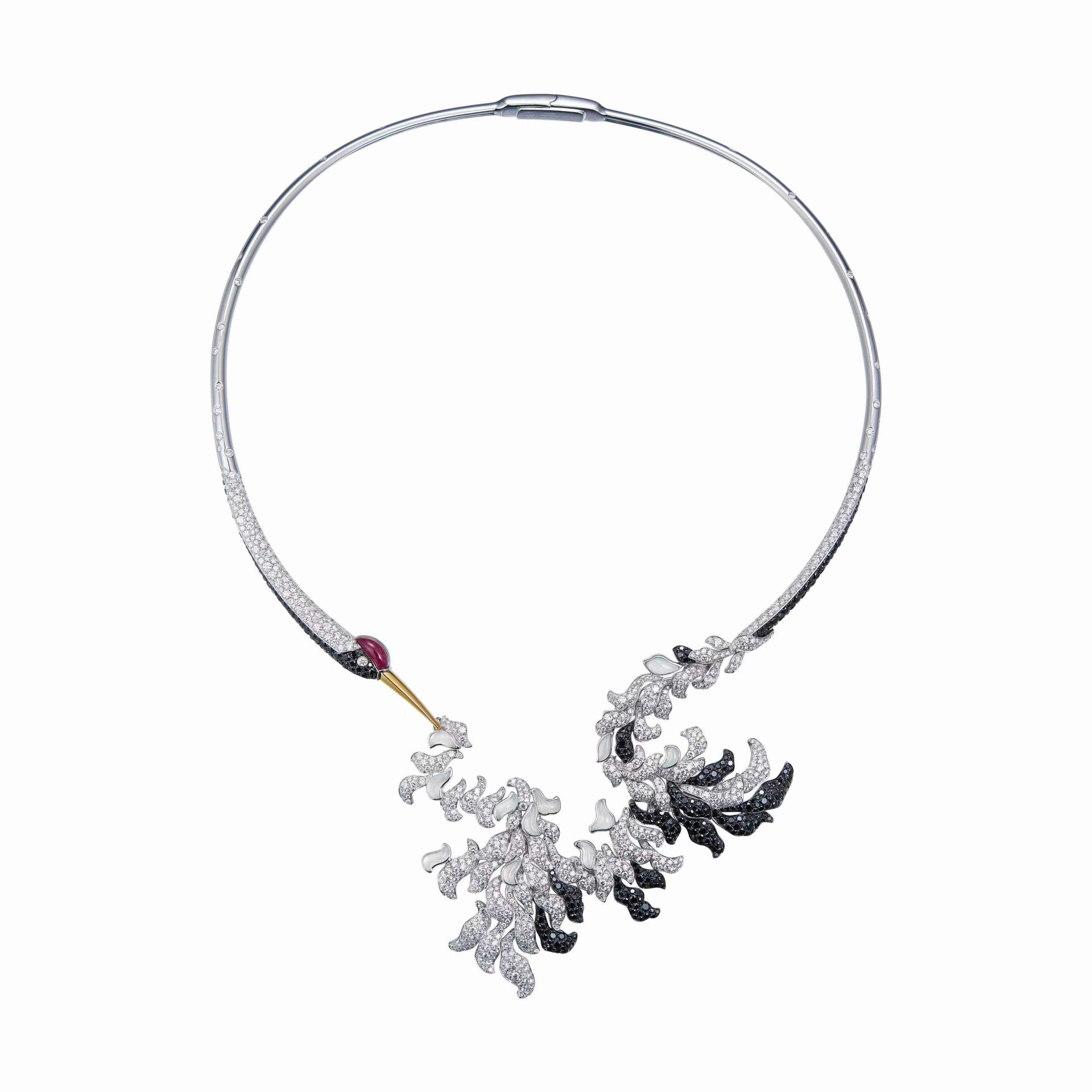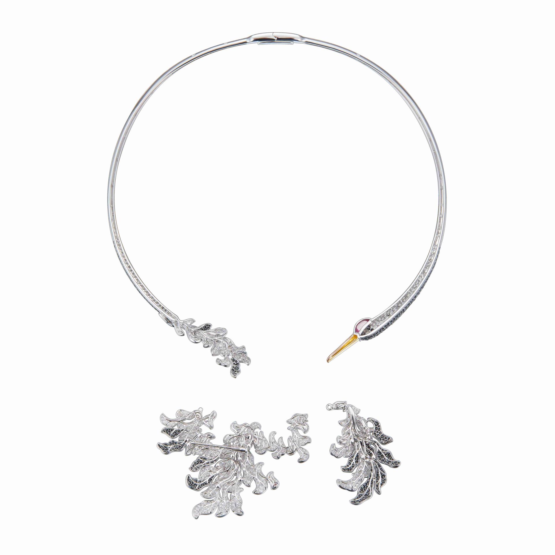 “DANCING IN CLOUDS” is a Chinoiserie-style jewelry necklace inspired by the totem of the crane. The piece fuses Eastern aesthetics with Western setting techniques. The crane’s long neck curves into a slender arc, echoing the pursuit of linear tension in Oriental art. Simple lines outline the overall silhouette, contrasting with the intricate lines of the tail and wings, creating a striking visual effect. The crane’s head connects with its tail, as if looking back to groom its feathers, capturing a vivid and graceful posture.