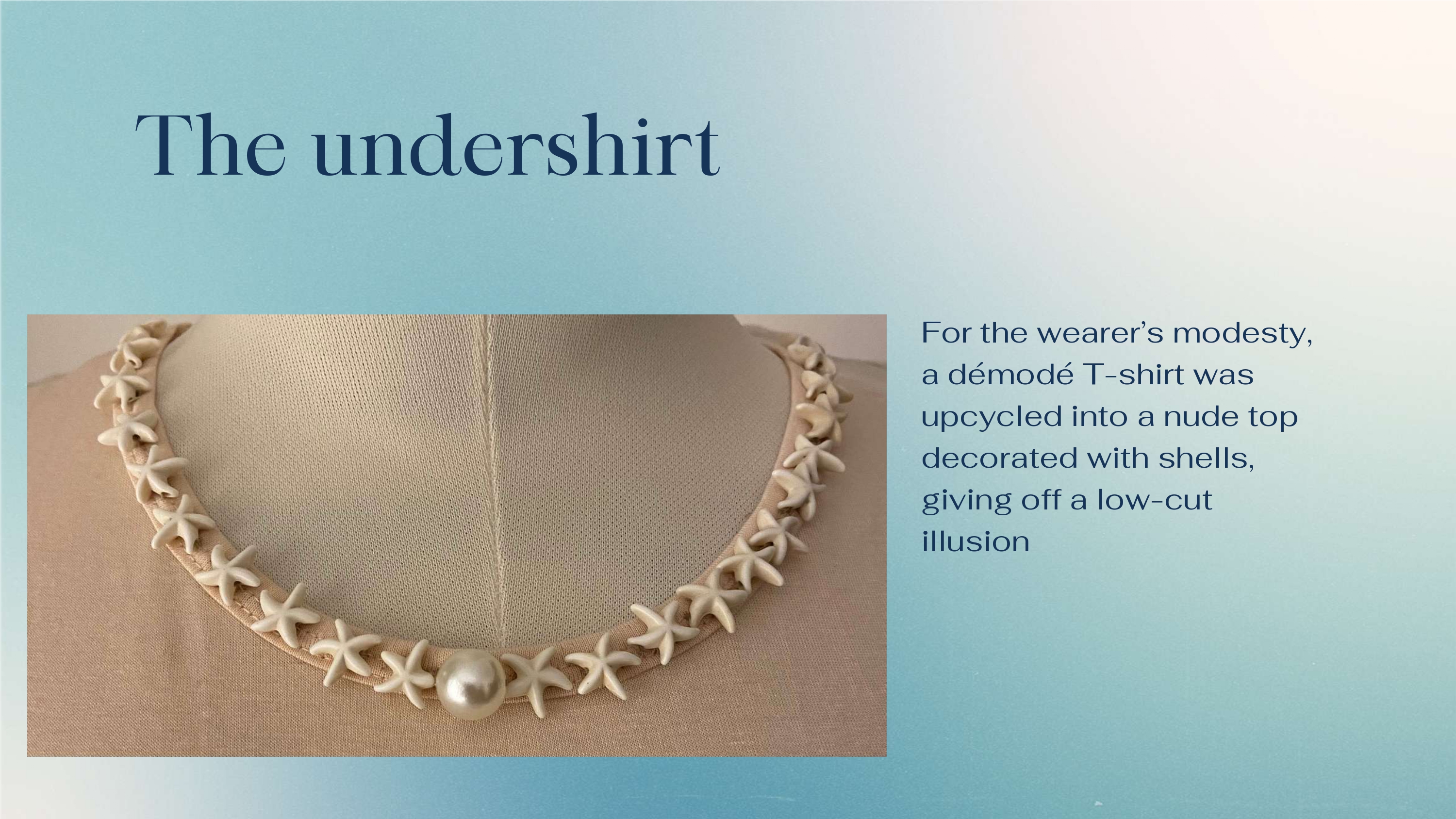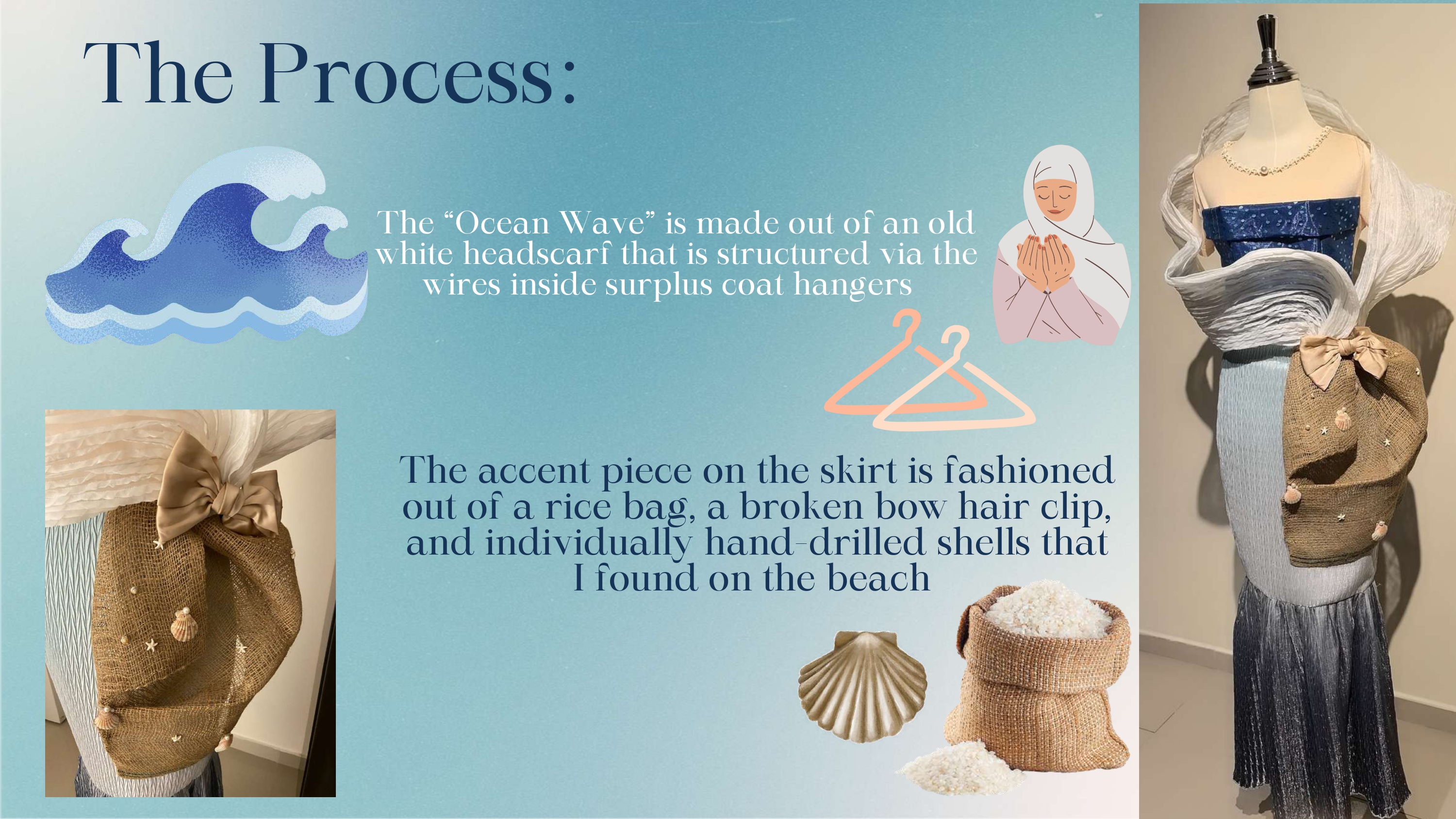 I found on the beach. The Skirt consists of a shimmery fabric simulating fish scales, a zipper recycled from an old hoodie, and a lining consisting of biodegradable silk. For the wearer’s modesty, a démodé T-shirt was up-cycled into a nude top decorated with shells, giving off a low-cut illusion. Layered over it, the top is contrived out of an Amazon gift bag I up-cycled into a 1950’s-esque ballgown top by sewing vertical darts on it. Finally, a place mat for plates is recycled into the mermaid’s clutch.