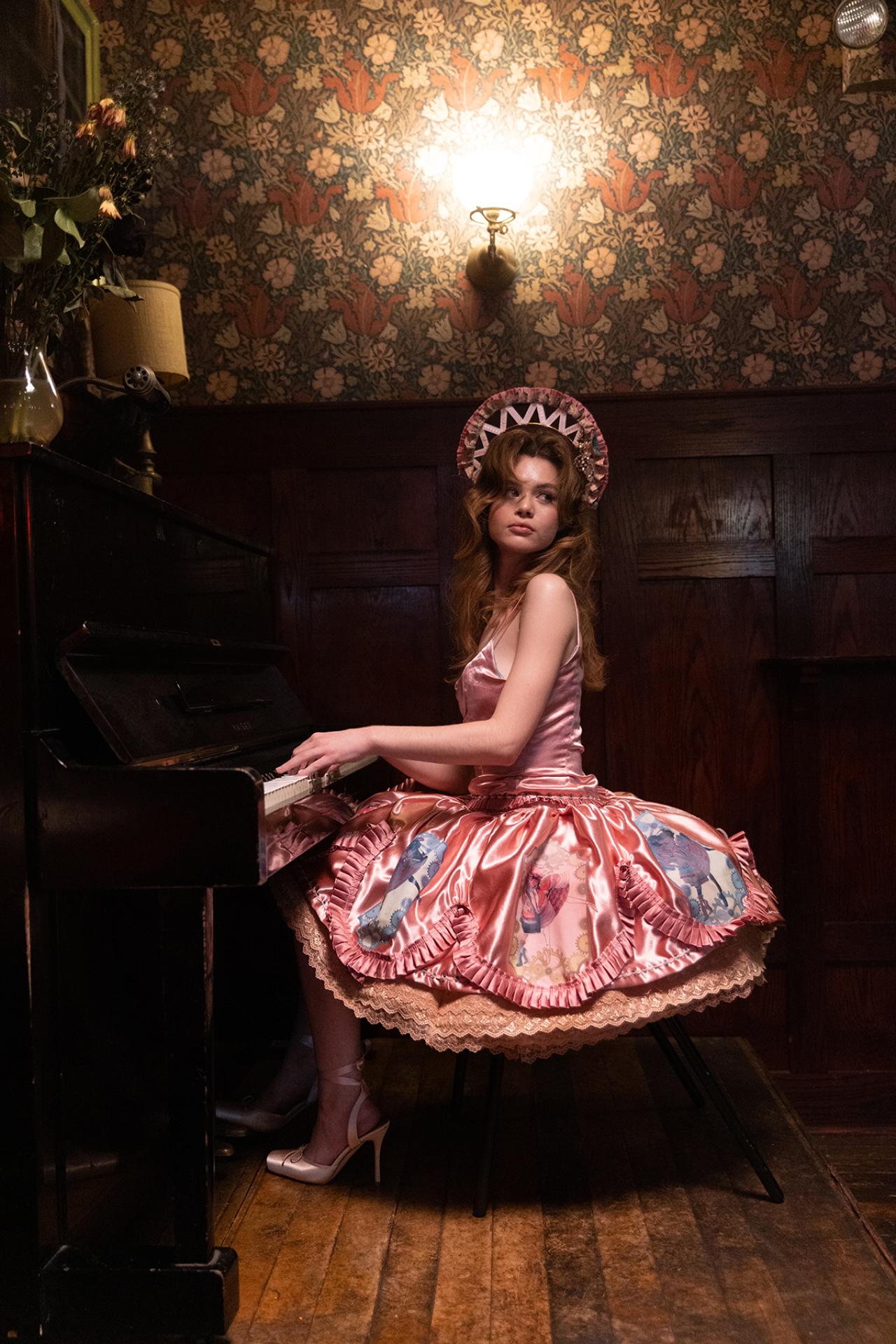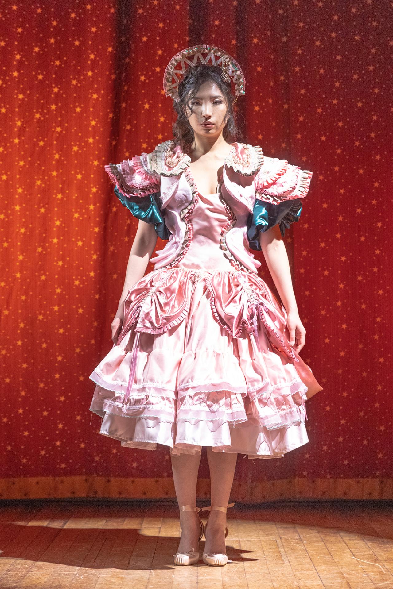 This collection is inspired by the aesthetics of vintage dolls, mainly ball-jointed dolls but elements of others such as fashion dolls and automata were also considered, to create an over-the-top, emotional, intricate, delicate yet somewhat eerie and suffocating feeling. The collection is built up as if one builds up a doll, from the structure, to the body, then the decor. Elements are taken from these aspects and used upon parts of the collection. The designer experimented on thermoplastic, a material that is moldable under heat, to mimic the process of doll-making by creating corset-like "molds" made mainly out of this material. Each garment has a solid "mold" made out of thermal plastic that mimics the doll figure that comes from the molding process during the making of ball jointed dolls, where a doll is made hollow by having a core of separate material upon which clay is built and shaped, emphasizing the suffocating nature of forcefully shaping someone against their will. Other imitations of dolls include an elastic strung mobile mechanical structure on one look, making the dress mobile according to the wearer's movement. The designer also designed a pair of electronic gear wheel that moves parts of the garment, similar to a pendulum. It is then realized with help from Turbulence Creative, an art-specializing tech consulting agency. This is inspired by the mobility of ball jointed dolls and automata. To achieve a fantastical yet slightly unnerving atmosphere, A pastel palette and intricate trims are well organized and heavily layered on top of one another to create glamorous yet heavy looks.